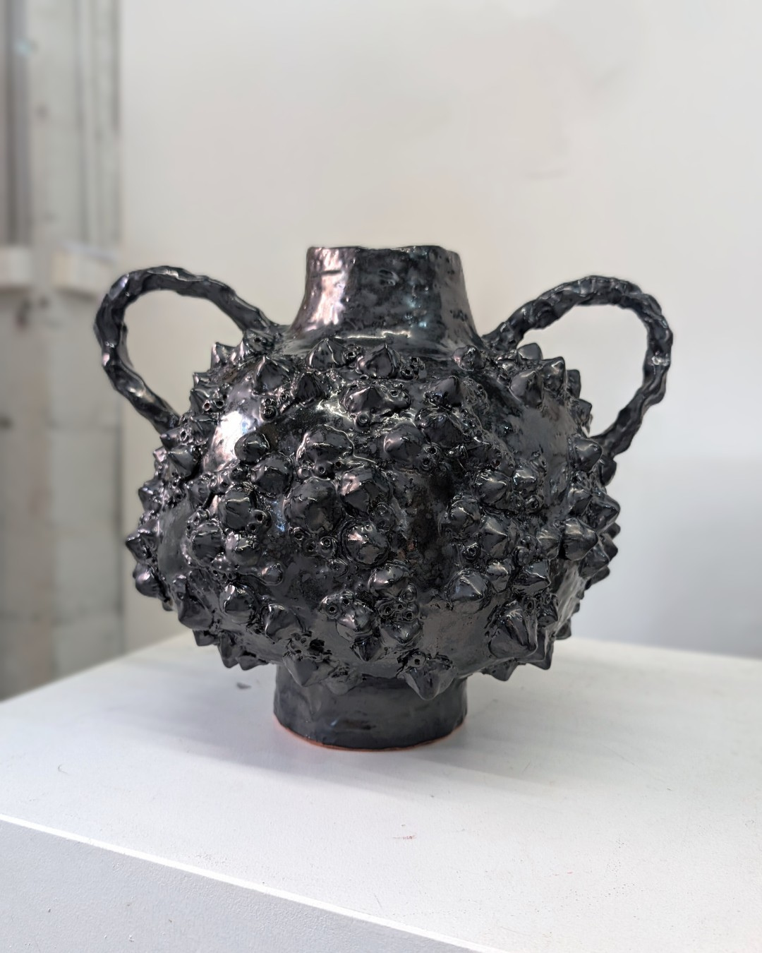 The Resonance Vessel’s metallic, almost mirrored glazed surface evokes a sense of heaviness. Grief is anything but dainty. The individually hand sculpted barnacle textures give rise to the idea that this vessel was dredged from the deepest depths of the ocean. The Resonance Vessel is part of a broader body of work that brings to life the ritualistic objects of a drowned ancient otherworldly religion. This sculpture stands to remind me to honour my darkest emotions. Loss need not eat away at me from the inside.